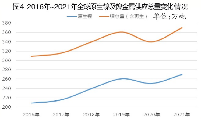 按歐盟和美國約50%的再生鎳使用量、中國20%左右的再生鎳應用比例綜合計算,全球的再生鎳利用比例在33%左右。考慮到2020年在新冠肺炎疫情影響下全球開工率較低(除中國外),折合計算的2020年全球再生鎳應用比例或在25%左右,2021年的比例也低于30%,由此折合計算的全球鎳(金屬)的供給總量從2016年的309萬噸上升至2021年的370萬噸左右,其間漲幅接近20%,年均增長率接近4%。