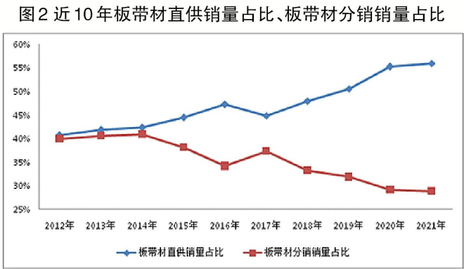 對近10年板帶材直供銷量占比、板帶材分銷銷量占比進行比較(見圖2)可知,板帶材直供銷量占比始終高于板帶材分銷銷量占比。2012年—2014年二者相差2個百分點以內;此后7年,二者差值基本呈擴大態勢(僅2017年有所縮小),2021年二者差值擴大至27.09個百分點。上述情況表明板帶材直供屬性日益突出,本質是鋼鐵企業與終端用戶的聯系日益緊密。