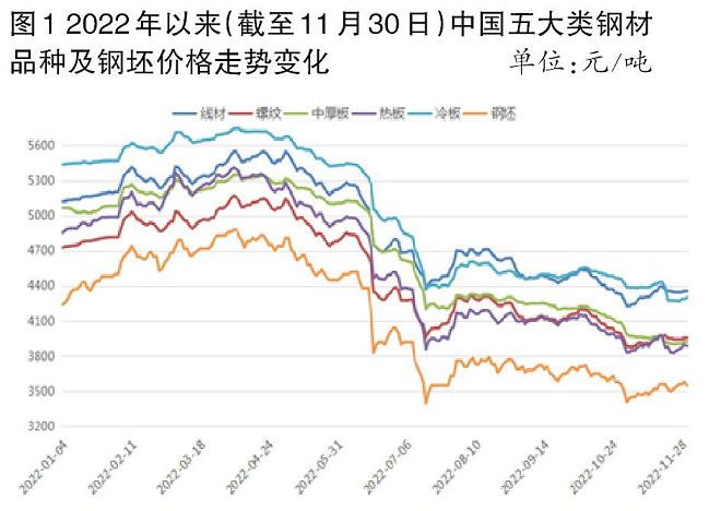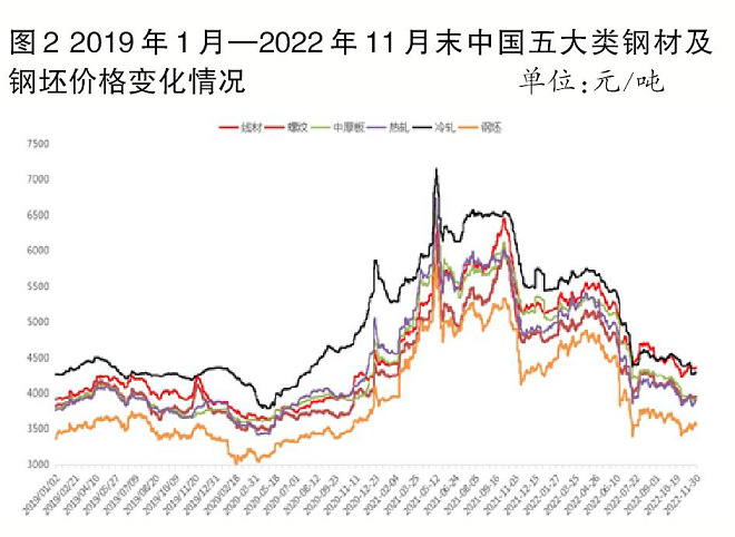 從11月份中國五大類鋼材品種的平均價格走勢上看(見圖1),螺紋鋼(HRB400E,直徑20毫米)均價為3932元/噸,較2021年均價下降22.3%;高線(直徑6.5毫米)均價為4328元/噸,較2021年均價下降20.0%;中厚板(普碳,20毫米)均價為3943元/噸,較2021年均價下降27.2%;熱板(3.0毫米)均價為3887元/噸,較2021年均價下降28.2%;冷板(1.0毫米)均價為4356元/噸,較2021年均價下降27.8%。綜合來看,2022年11月份五大類鋼材均價較2021年均價下降25.1%。