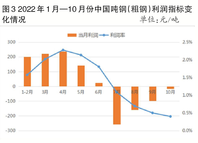 根據國家統計局數據(見圖3),2022年1月—10月份,我國黑色金屬冶煉和壓延加工業共實現營業收入73045.5億元、行業利潤296.8億元,累計利潤值較1月—9月份累計利潤水平下降了16.2億元,說明10月份的黑色金屬冶煉和壓延加工業整體仍處于虧損狀態。2022年下半年以來,中國黑色金屬冶煉和壓延加工業已經連續4個月虧損。經國家統計局數字計算,1月—10月份我國黑色金屬冶煉和壓延加工業累計利潤率僅為0.4%,利潤水平較2021年同期下降92.7%。