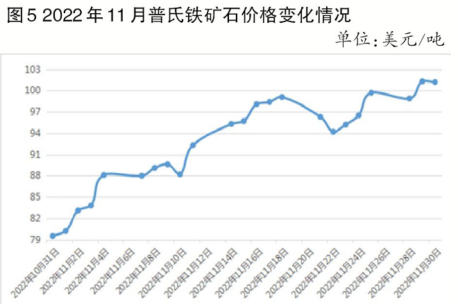 11月份,中國進口鐵礦價格(普氏,62%)走出逆勢上揚格局(見圖5)。截至11月30日,普氏鐵礦石價格指數(62%,中國主要港口,干基,不含稅)由10月31日的79.5美元/噸大幅上揚至11月30日的101.2美元/噸,漲幅高達27.3%,與疲態盡顯、弱勢運行的鋼材價格形成了鮮明的對比。