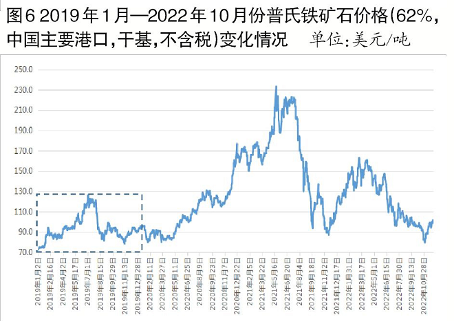 截至11月末,2022年的普氏鐵礦石價格(62%,中國主要港口,干基,不含稅)全年走勢“前高后低”,年均價為121.0美元/噸,較2021年年均價格下降24.1%。從2019年以來的普氏鐵礦石價格曲線上看(見圖6),目前鐵礦石價格已經回落至2019年的價格水平。