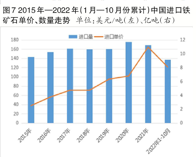另外,根據中國海關總署公布的數據,10月份,我國進口鐵礦石9497.5萬噸,月均進口價格為96.8美元/噸,自2020年8月以來首次低于100美元/噸;1月—10月份,我國累計進口鐵礦石91741.6萬噸,累計平均進口價格為121.3元/噸。預計2022年全年,中國進口鐵礦石總量仍將維持11億噸左右的絕對數量,年均進口單價預計為120美元/噸。