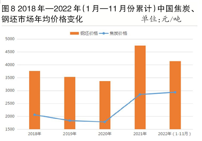 受今年煤炭行業嚴格的保供政策影響,煉焦煤出現供應趨緊的短期供需錯配,加之持續的環保壓力,今年前11個月,中國焦炭(準一級)平均價格為2929元/噸,較2021年2843元/噸的年均價格再度上行近100元/噸,一定程度上助推了鐵水成本上升。而2022年鋼材價格則因下游需求減弱而相對走低,造成鋼鐵企業利潤大幅下降,構成了2022年鋼鐵行業利潤驟減的“名義原因”。