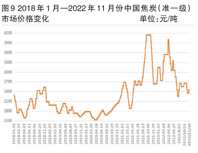 但是,從2018年以來焦炭價格的運行軌跡上看(見圖9),目前焦炭價格處于自2018年執行嚴格環保政策以來的平均價位附近。另外,行業相關調查數據顯示,2022年1月—11月份,我國煉焦行業也處于全線虧損狀態,并未實現盈利。因此,鐵礦石的非對稱價格運行才是真正“元兇”。