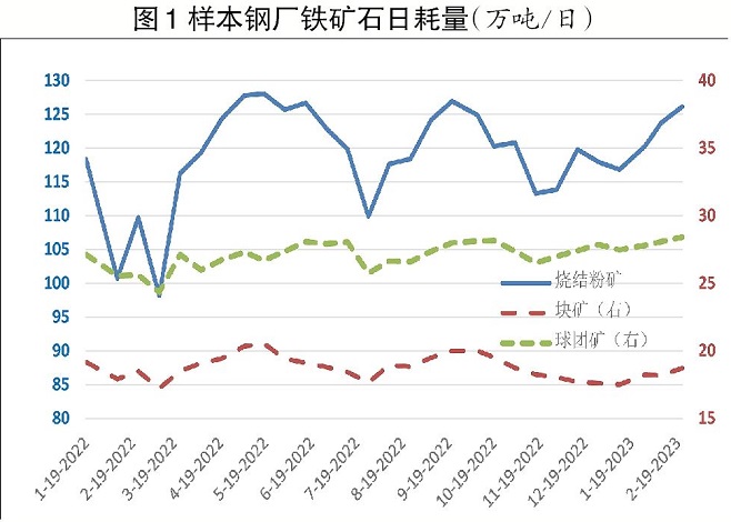 在2023年1月份的強預期下,高爐進入復產期,日耗量逐漸升高;至2023年2月下旬時,全國樣本鋼廠的燒結粉礦、塊礦和球團礦日耗量共達到173.26萬噸,同比增加近20萬噸,增幅12.0%,已趨近于2022年峰值。