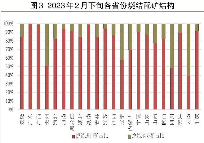 另外,2月下旬燒結粉礦結構中,地方礦占比16%,同比小幅增加了2個百分點。2022年因環保限產和疫情反復,地方礦供應受限,日耗占比相對較低,而2023年開工率逐漸回升后,日耗占比也有相應提高。