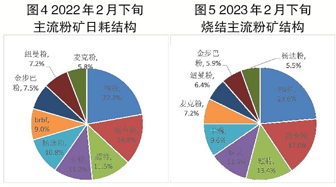 燒結用主流粉礦品種結構。圖4和圖5所示分別為最近兩年同期燒結用主流粉礦的品種結構。由圖可見,PB粉作為中品位主流資源的典型代表,其日耗保持首位,占比在23%左右,變化不大。FMG混合和超特粉作為低品位主流資源,雖然礦山給的價格折扣一再下降,性價比也較低,但鋼廠因利潤持續不佳而對其保持較強的需求,日耗占比仍保持前位。2023年2月下旬,FMG混合和超特粉占比同比上年都有所擴大,二者合計占比由26.3%提高至30.4%。