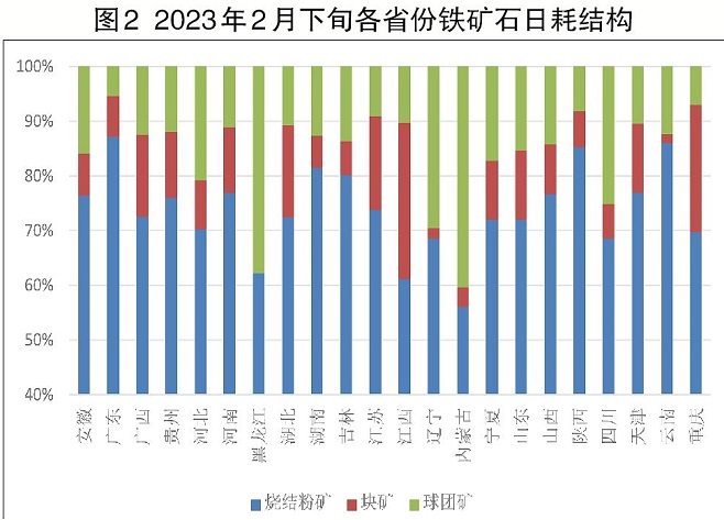 樣本鋼廠所在省份鐵礦石日耗種類結構。圖2所示為2月下旬調研樣本鋼廠所在省份的鐵礦石平均日耗種類結構。由圖可知,第一,燒結粉礦日耗占比相對較大的省份是廣東、云南和陜西,都在85%以上;占比相對較低的是內蒙古,僅56%;其余地區都在60%~80%。全國樣本地區平均占比73%。第二,塊礦日耗占比較高的是江西,達到29%;其次是重慶,也達到23%;黑龍江的樣本鋼廠2023年2月下旬未使用塊礦,遼寧和云南樣本鋼廠塊礦日耗占比也僅為2%。樣本鋼廠塊礦日耗平均占比11%。第三,球團礦日耗占比較高的是內蒙古和黑龍江,分別達到40%和38%;占比較低的是廣東,僅占5%。球團礦日耗平均占比16%。