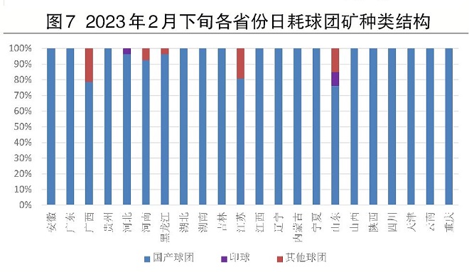 第六,2023年2月下旬,日耗球團礦的結構同比變化相對較大,國產球團礦占比大幅提升,由88%提高至95%。大多地區所用球團礦幾乎都為國產球團礦,但山東、江蘇和廣西用了較高比例的進口球團礦(約占20%)。其中,烏克蘭球團礦日耗降為了0,印度球團礦也有小幅減少。