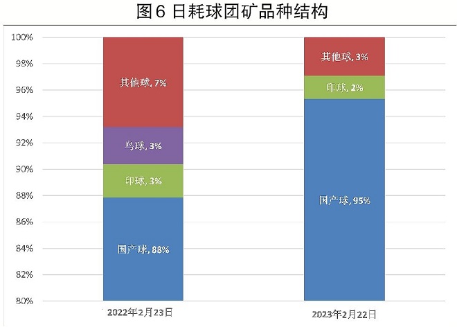 全國日耗球團礦品種結構。圖6所示為全國2022年2月下旬和2023年2月下旬全國樣本鋼廠日耗球團礦的品種結構。可以發現,日耗球團礦的結構變化相對較大。其中,國產球團礦占比大幅提升,由88%提高至95%。原因主要是2022年球團廠受環保限產的影響,供應受限,而今年此影響明顯減弱,供應量明顯回升,故絕大多數球團礦實現了國產化。同時,因俄烏沖突的影響,烏克蘭球團礦無法正常生產,今年已無進口,故其日耗占比由3%降為了0。
