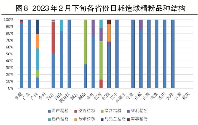 各省份日耗造球精粉品種結構。圖8所示為2023年2月下旬,各省樣本鋼廠自產球團時日耗造球精粉品種結構。由圖可見,河北、廣西和江西有自產球團的樣本鋼廠,所用造球精粉品種相對較多,有4種~5種,而江蘇樣本鋼廠自產球團時全部用進口鐵精粉,其他地區多是國產精粉加0~2種進口精粉。另外,貴州、湖北、內蒙古、云南和重慶的樣本鋼廠無自產球團,所用皆為外購,故沒有造球精粉日耗。