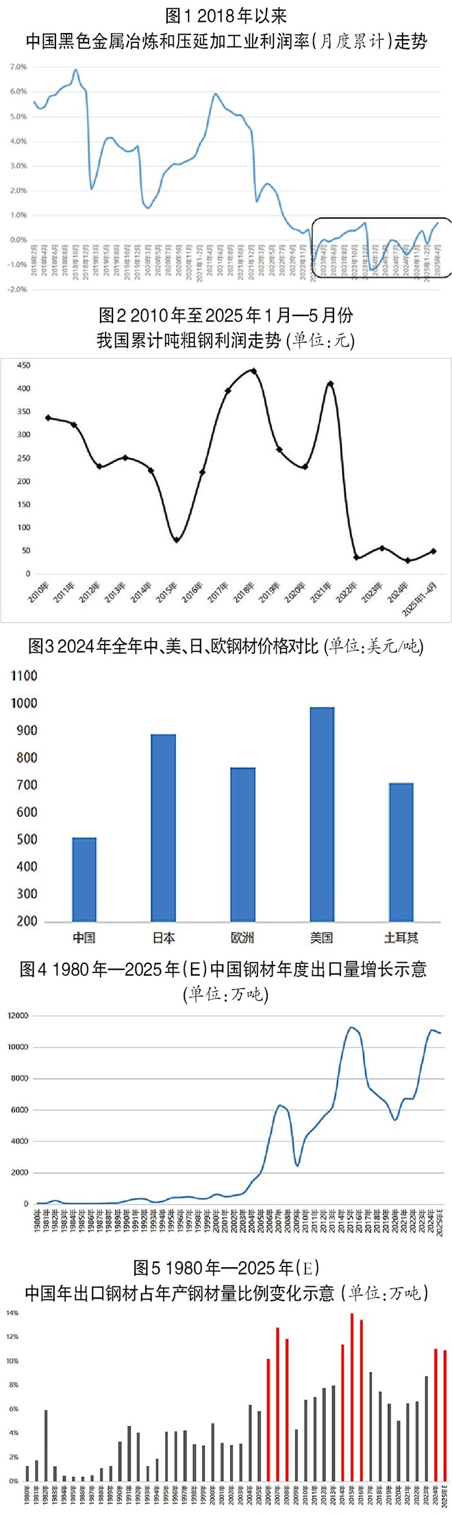 國家統計局數據顯示,2025年1月—5月份的行業累計利潤率為1.0%,而這一水平已經是自2022年7月以來的最好水平。隨著房地產行業對經濟的拉動作用逐漸被新興產業所替代,我國鋼鐵行業整體利潤下滑嚴重。自2023年1月起,我國黑色金屬冶煉和壓延加工業整體利潤率始終圍繞著零基準線上下浮動,累計利潤率由2018年的6.0%下降至2024年的0.4%。