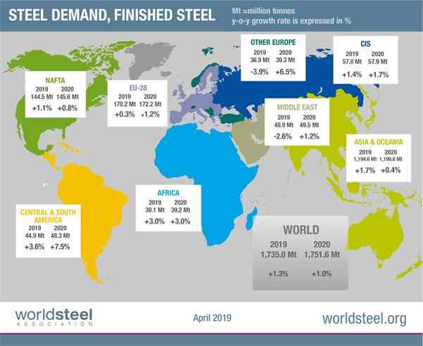 世界鋼鐵協會今天發布了2019年4月版短期鋼鐵需求預測結果。據預測,2019年全球鋼鐵需求將達到17.35億噸,同比增長1.3%。2020年,鋼鐵需求預計將增長1.0%,達到17.52億噸。