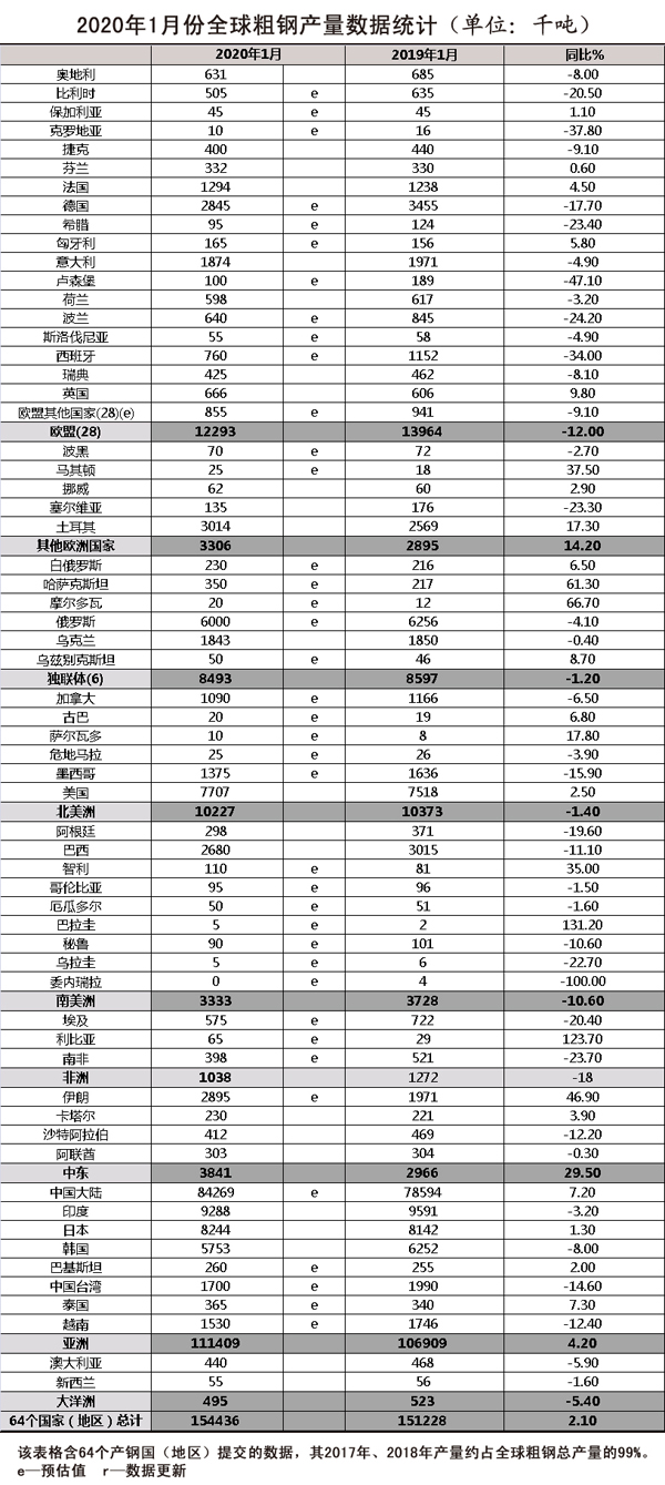 本報訊(記者朱曉波)2月25日,世界鋼鐵協會(WSA)發布了1月份全球粗鋼產量數據。1月份,全球64個納入世界鋼協統計的國家和地區粗鋼產量為1.544億噸,同比增長2.1%。