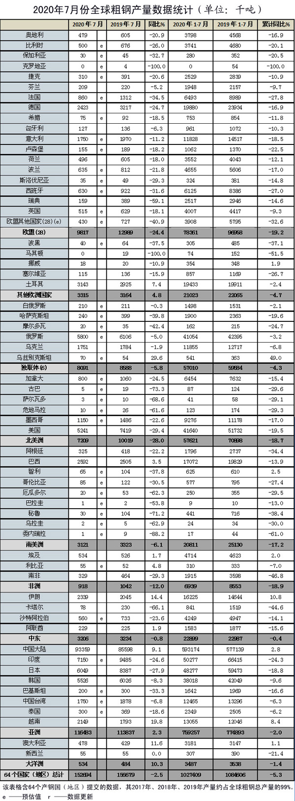 從重點國家和地區來看,7月份,中國大陸粗鋼產量為9336萬噸,同比增長9.1%;印度預估粗鋼產量為715萬噸,同比下降24.6%;日本粗鋼產量為605萬噸,同比下降27.9%;韓國粗鋼產量為553萬噸,同比下降8.3%。歐盟國家中,德國粗鋼產量為242萬噸,同比下降24.7%;意大利預估粗鋼產量為175萬噸,同比下降11.2%;法國預估粗鋼產量為86萬噸,同比下降34.5%;西班牙預估粗鋼產量為63萬噸,同比下降31.6%。美國粗鋼產量為524萬噸,同比下降29.4%。俄羅斯預估粗鋼產量為580萬噸,同比下降5.0%。烏克蘭粗鋼產量為175萬噸,同比下降1.9%。巴西粗鋼產量為259萬噸,同比增加3.5%。土耳其粗鋼產量為314萬噸,同比增長7.4%。