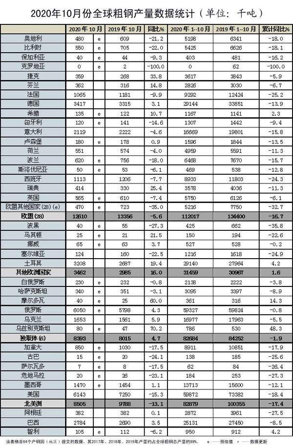 本報訊(記者朱曉波)11月24日,世界鋼鐵協會(WSA)發布了10月份全球粗鋼產量數據。10月份,全球64個納入世界鋼協統計的國家和地區粗鋼產量為1.619億噸,同比增加7.0%。