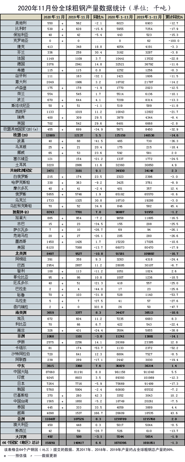 11月份,亞洲粗鋼產(chǎn)量為1.16億噸,同比增長8.3%;歐盟粗鋼產(chǎn)量為1281萬噸,同比增長5.5%;北美洲粗鋼產(chǎn)量為850萬噸,同比下降10.8%;南美洲粗鋼產(chǎn)量為366萬噸,同比增長8.3%;中東地區(qū)粗鋼產(chǎn)量為362萬噸,同比增長7.6%;獨(dú)聯(lián)體粗鋼產(chǎn)量為824萬噸,同比增長7.0%。