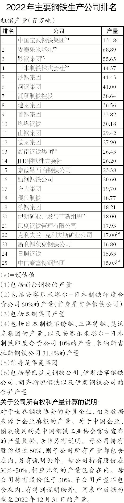 從企業(yè)排名來看,2022年全球主要鋼鐵生產企業(yè)粗鋼產量前10名中,6家企業(yè)為中國鋼企。前10名依次為中國寶武(1.31億噸)、安賽樂米塔爾(6889萬噸)、鞍鋼集團(5565萬噸)、日本制鐵(4437萬噸)、沙鋼集團(4145萬噸)、河鋼集團(4100萬噸)、浦項制鐵(3864萬噸)、建龍集團(3656萬噸)、首鋼集團(3382萬噸)、塔塔鋼鐵(3018萬噸)。