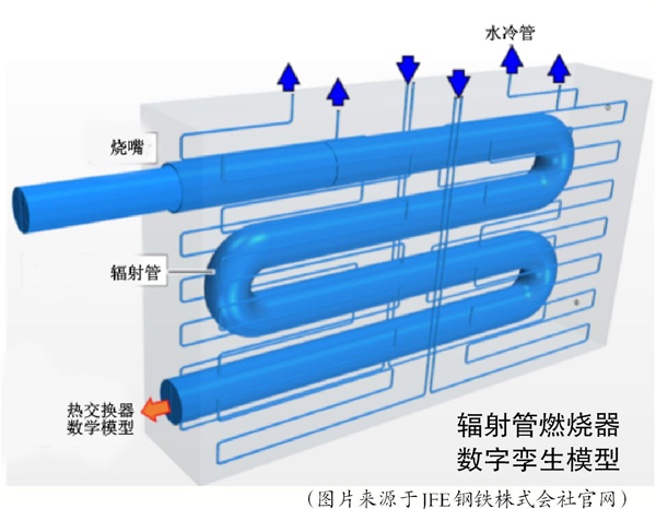 在這項研究中,JFE鋼鐵株式會社率先開發了一個數字孿生平臺,基于測試數據和測試爐燃燒測試獲得物理模型,在虛擬空間展現了燃燒過程。隨后,該公司利用數字孿生技術又自主開發了一種新型爐內輻射管支撐結構、燃燒器環境、傳熱促進器和換熱器,并將輻射管縱切面由圓形改為橢圓形,最終組成了新型輻射管燃燒器。