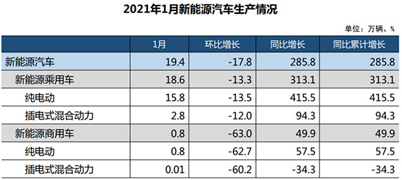 1月,新能源汽車產(chǎn)銷分別完成19.4萬輛和17.9萬輛,環(huán)比分別下降17.8%和27.8%,同比分別增長285.8%和238.5%。新能源汽車?yán)^續(xù)刷新單月銷量歷史記錄,目前已連續(xù)7個月。