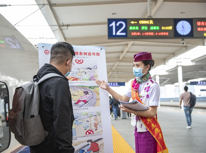 中國鐵路成都局重慶客運(yùn)段的志愿者向旅客宣講鐵路安全知識(shí)。記者 黃偉 攝