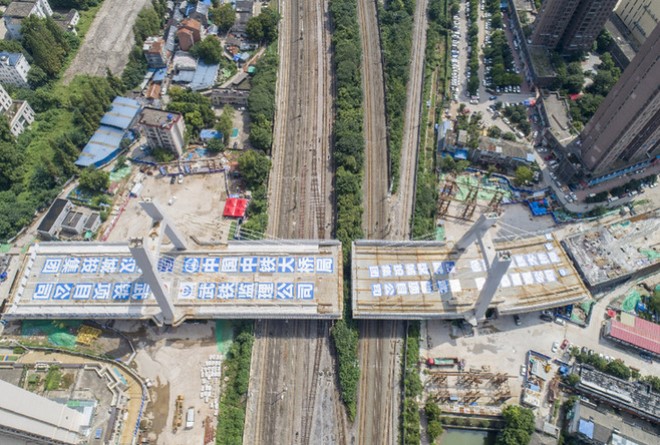 當日,由武漢武鐵工程項目管理公司代建、中鐵大橋院設計、中鐵大橋局承擔施工的建安街上跨鐵路橋東主塔墩梁體轉體到位。該橋為鋼箱梁斜拉橋,采用高低塔鋼箱梁斜拉橋上跨鐵路布置形式,全長519.3米,其中主橋全長245米,橋面寬35.2米。