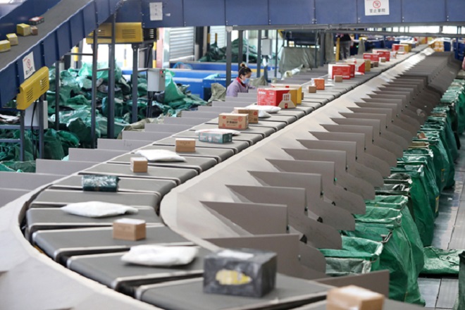 11月10日,在淮北市烈山區一家快遞企業分撥中心,工作人員在分揀車間忙碌。