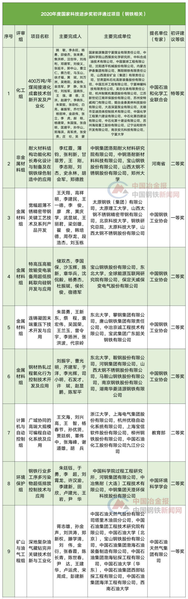 在鋼鐵行業(yè)中,鞍鋼、河鋼、太鋼、南鋼、馬鋼等多家鋼企的項(xiàng)目通過2020年度國(guó)家科學(xué)技術(shù)獎(jiǎng)初評(píng)。具體內(nèi)容整理如下表: