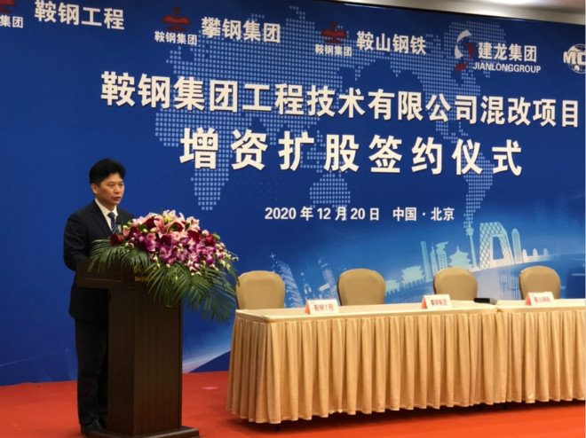 鞍鋼集團總經理、黨委副書記戴志浩,北京建龍重工集團董事長、總裁張志祥,中冶科工集團黨委副書記、中國中冶總裁張孟星,上海聯合產權交易所黨委書記、總裁周小全出席簽約儀式并發表致辭。鞍鋼工程發展公司黨委書記、董事長于峰主持簽約儀式。