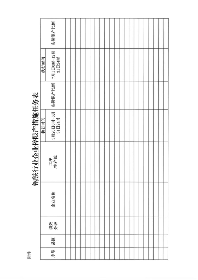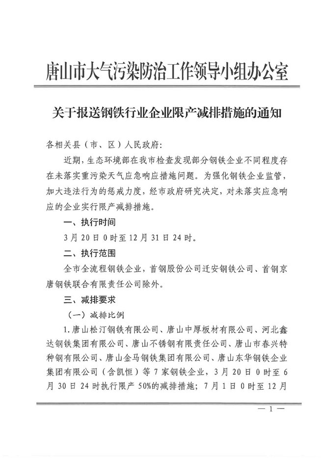 從《通知》獲悉,自3月20日起直至今年年底,除首鋼股份公司遷安鋼鐵公司、首鋼京唐鋼鐵聯合有限責任公司外,唐山市全流程鋼鐵企業全部實行限產減排措施。