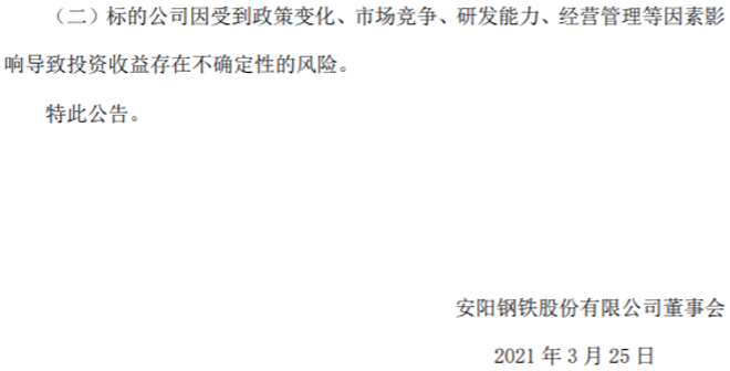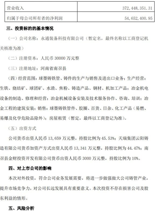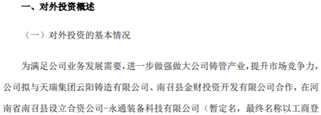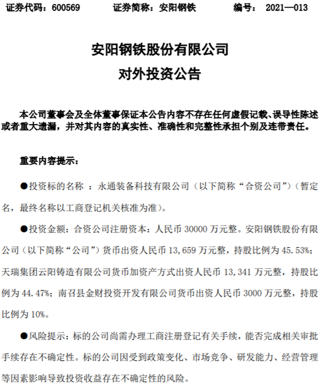 3月26日,安陽鋼鐵發(fā)布公告稱,該公司擬與天瑞集團云陽鑄造有限公司、南召縣金財投資開發(fā)有限公司合作,在河南省南召縣設立合資公司——永通裝備科技有限公司。合資公司注冊資本3億元。安陽鋼鐵貨幣出資1.37億元,持股比例45.53%。公告表示,此次對外投資,將進一步做強做大安陽鋼鐵鑄管產業(yè)。
