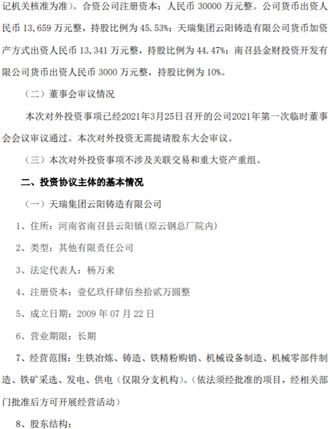 資料顯示,天瑞集團云陽鑄造有限公司,原屬天瑞集團全資子公司,注冊資金1.94億元。2020年6月份,天瑞集團已與安鋼集團、南召縣人民政府簽訂戰(zhàn)略合作協(xié)議,三方共同出資建設云鑄70萬噸高端鑄造項目。