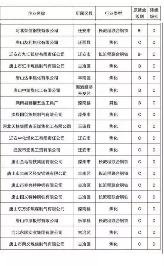 值得注意的是,前不久,唐山市大氣辦已經對部分企業績效等級進行過一次降級。