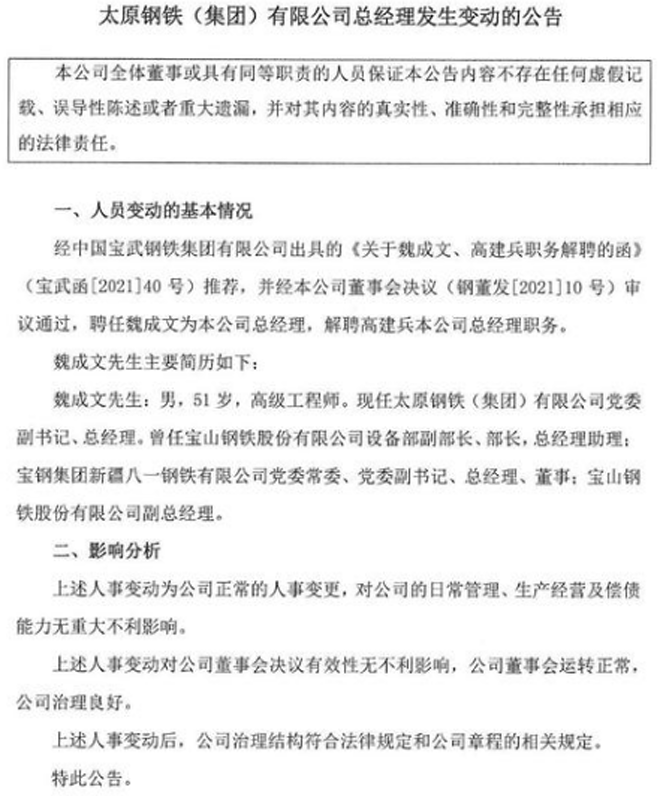 4月9日,太原鋼鐵(集團(tuán))有限公司發(fā)布公告稱,聘任魏成文為該公司總經(jīng)理,解聘高建兵該公司總經(jīng)理職務(wù)。