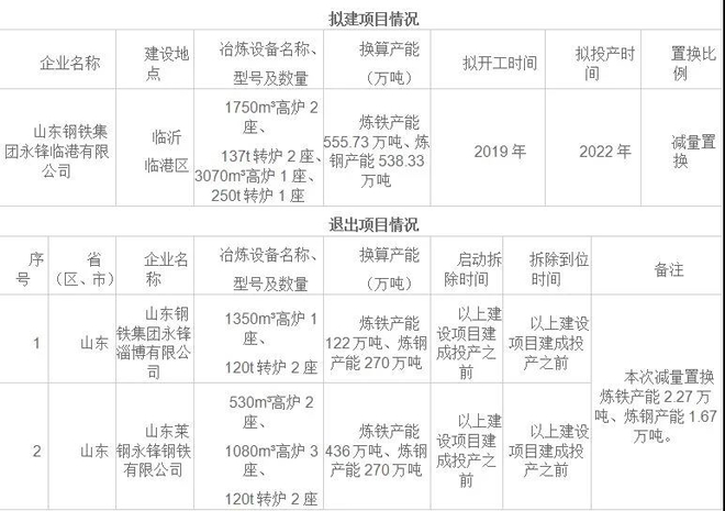 據了解,2019年,山東省工業和信息化廳就公告了山東鋼鐵集團永鋒淄博有限公司建設項目產能置換方案。