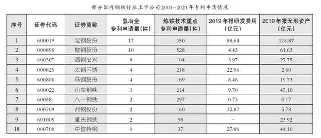 下表中列出了部分國內鋼鐵企業上市公司的部分經營數據和專利申請情況,其中專利申請量是以2001年1月1日至2021年3月31日的公開數據為基礎,考慮到部分公司的2020年年報尚未公布以及2020年的疫情影響,表中的研發費用和無形資產以2019年年報數據為基礎。