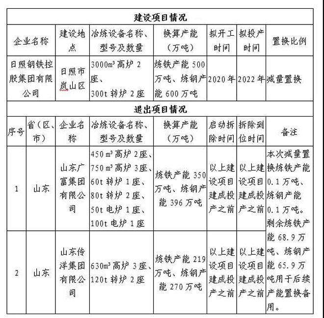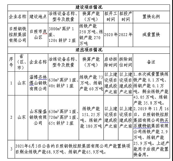 6月3日,山東省工業(yè)和信息化廳將日照鋼鐵控股集團(tuán)有限公司(簡稱“日照鋼鐵”)產(chǎn)能置換方案進(jìn)行了公示,據(jù)悉,日照鋼鐵擬減量置換新建3000m3高爐3座。詳情如下表: