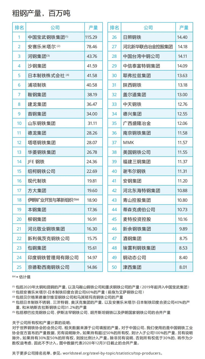2020年全球主要鋼鐵生產公司粗鋼產量排名如下表: