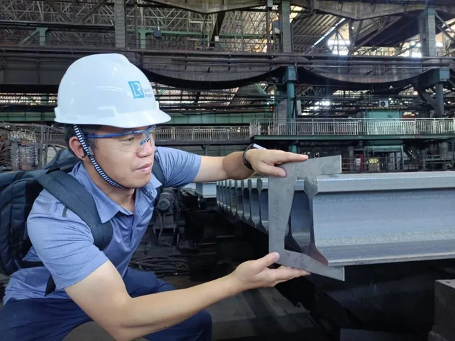 5月21日,在攀鋼釩軌梁廠萬能二線成品庫區,一名英國勞氏船級社技術人員在該廠相關工作人員的陪同下,驗收用于供應墨西哥“瑪雅鐵路”的115RE鋼軌。根據合同,這已經是攀鋼在今年為該項目定制生產的第三批鋼軌。