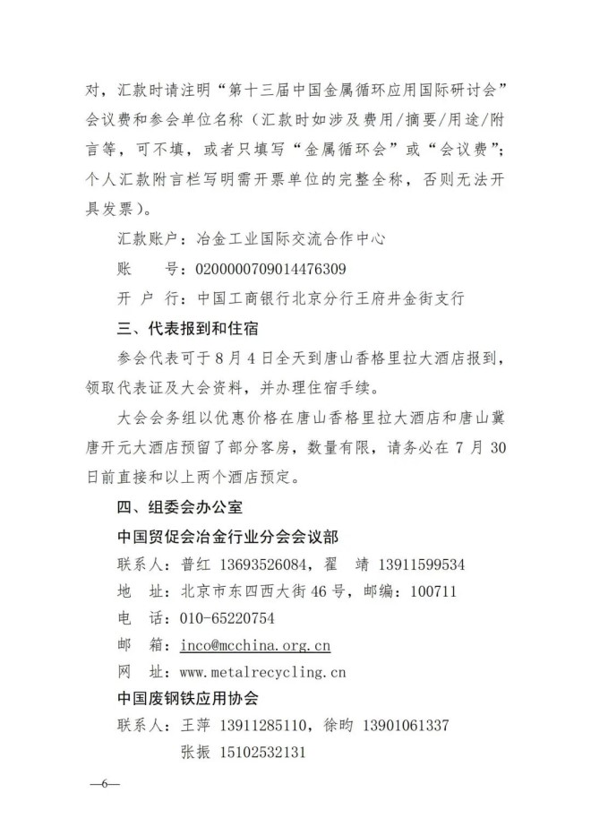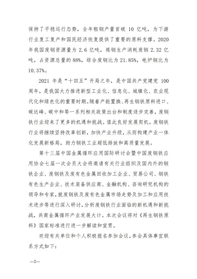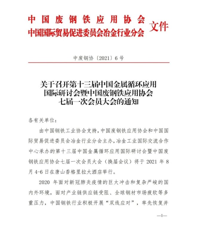 關(guān)于召開第十三屆中國金屬循環(huán)應(yīng)用國際研討會(huì)暨中國廢鋼鐵應(yīng)用協(xié)會(huì)七屆一次會(huì)員大會(huì)的通知