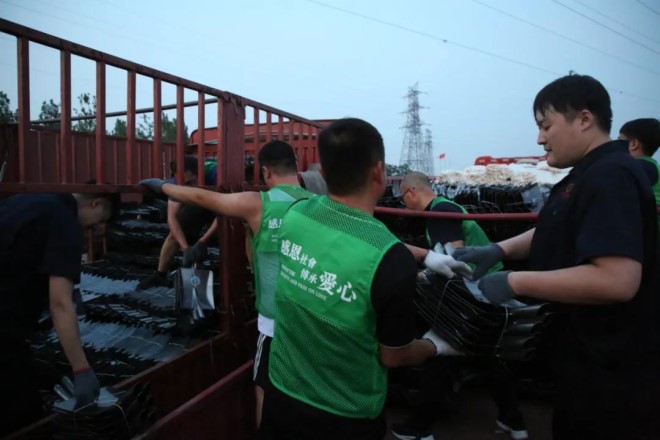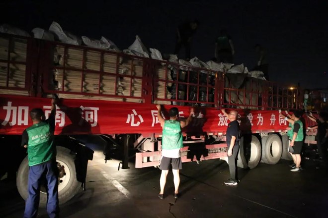 7月25日,在由50余名榮程青年組成的榮程志愿團的連續(xù)奮戰(zhàn)下,榮程集團新一批近15萬件針對當前河南省抗洪救災最急需的物資已連夜運抵周口災區(qū)并投入救援。