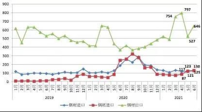 海關數據顯示,2021年上半年,我國累計出口鋼材3738.2萬噸,同比增長30.2%。同期,累計進口鋼材734.9萬噸,同比增長0.1%;累計進口鋼坯574.90萬噸,同比增長3.8%。考慮鋼坯進口,2021年上半年我國粗鋼凈出口2554.27萬噸,凈出口量已經超過去年全年的1703萬噸。