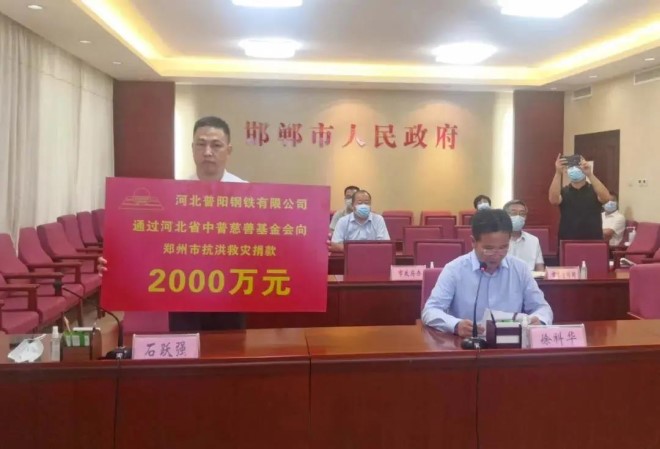 7月下旬,受極端降雨侵襲,河南鄭州市多地遭受洪澇災害,給人民群眾生產生活造成嚴重損失。8月9日下午,河北普陽鋼鐵集團通過河北省中普慈善基金會向鄭州市捐款2000萬元(含職工捐款206.05萬元)用于抗洪救災。鄭州市政府副市長孫曉紅出席捐贈儀式,邯鄲市政府黨組成員徐科華主持,河北普陽鋼鐵集團黨委副書記、總經理石躍強出席了儀式。考慮到疫情防控需要,儀式以視頻形式開展。