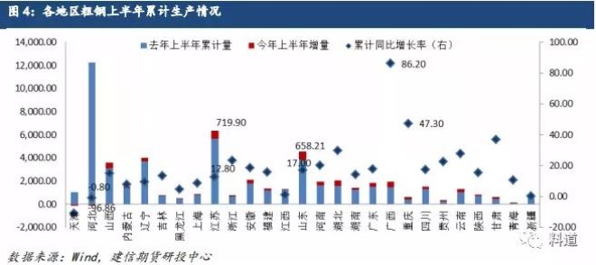 圖4數據顯示,從地區來看,江蘇、山東地區的粗鋼產量增量較大,上半年累計較去年增長了719.9、658.21萬噸,同比增長12.8%、17%,而河北因為唐山粗鋼限產的原因,上半年累計產量較去年下降96.86萬噸,同比下降0.8%。上半年累計同比較快的有廣西和重慶地區,增長率分別為86.2%與47.3%