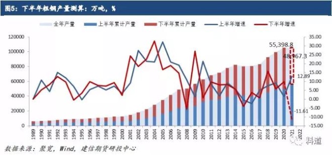 2020年我國粗鋼累計產量共計105299.9萬噸,2021年1-6月我國粗鋼產量共累計56333萬噸,按照粗鋼平控要求,下半年粗鋼產量則不得超過48966.9萬噸,即下半年較2020年減少需超6431.5萬噸,同比不得超過-11.61%。