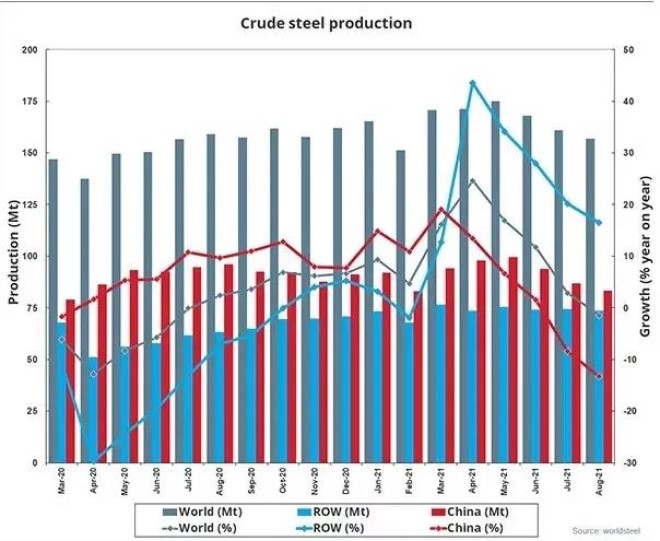 2021年8月份,全球64個納入世界鋼鐵協會統計國家的粗鋼產量為1.568億噸,同比下降1.4%。