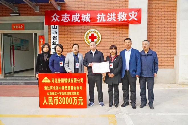 10月上旬,受強降雨影響,山西省多地發生洪澇災害,災區人民群眾的生命健康和財產安全受到嚴重影響,災情牽動著全體普陽人的心。為幫助山西受災群眾盡快戰勝困難、恢復生產生活,10月15日,河北普陽鋼鐵集團通過河北省中普慈善基金會向山西省紅十字會捐款3000萬元,定向用于長治市及襄垣縣防汛救災和災后重建等工作。