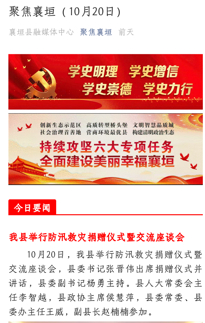 10月20日下午,襄垣縣舉行防汛救災捐贈儀式暨交流座談會,縣委書記張晉偉出席捐贈儀式并講話,縣委副書記楊勇主持。縣人大常委會主任李智越,縣政協主席侯慧萍,縣委常委、縣委辦主任王威,副縣長趙楠楠參加。河北普陽鋼鐵集團董事長郭龍鑫、副總經理張勝利應邀出席。