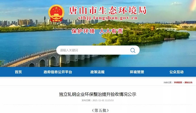 11月1日,唐山市生態環境局發布了第五批獨立軋鋼企業環保整治提升驗收情況公示。